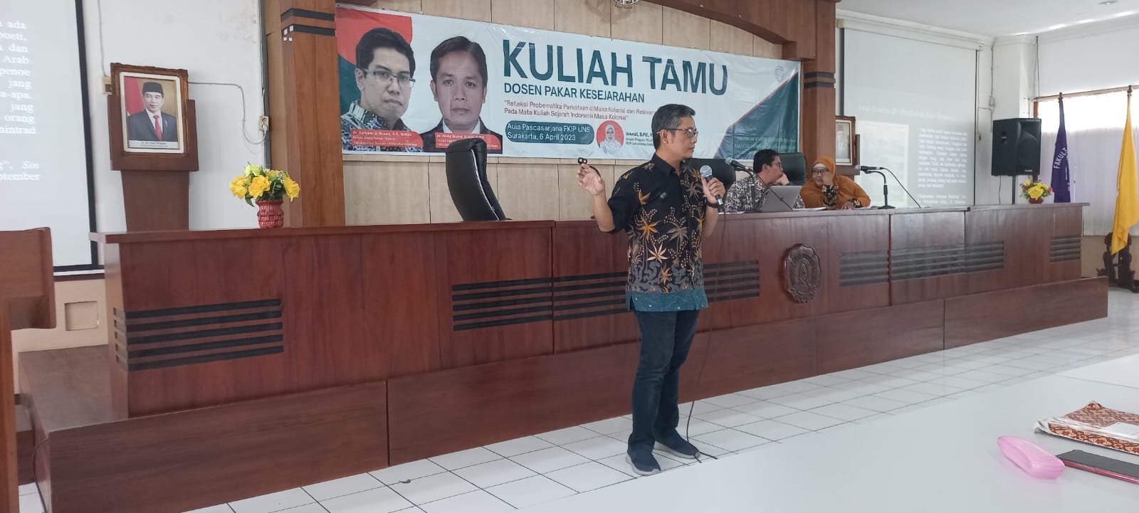 Pada hari Kamis, 6 April 2023 bertempat di Aula Pascasarjana Lantai 3 FKIP UNS, Program Studi S1 Pendidikan Sejarah berhasil menyelenggarakan Kuliah Tamu Dosen Pakar Kesejarahan dengan tema “Refleksi Probematika Perkotaan di Masa Kolonial dan Relevansinya Pada Mata Kuliah Sejarah Indonesia Masa Kolonial”. Kali ini, Prodi Pendidikan Sejarah UNS menghadirkan narasumber dosen dari dua kota ternama di Indonesia yakni Yogyakarta dan Surabaya. Kedua narasumber ini adalah Dr. Abdul Wahid, M.Hum, M.Phil dari Departemen Sejarah, Fakultas Ilmu Budaya, Universitas Gadjah Mada (UGM) dan Dr. Sarkawi B. Husain, S.S., M.Hum dari Departemen Sejarah, Fakultas Ilmu Budaya, Universitas Airlangga. Kagiatan kuliah tamu dosen ini dipandu oleh seorang moderator, Isawati, S.Pd., M.A., dosen Prodi S1 Pendidikan Sejarah FKIP UNS.