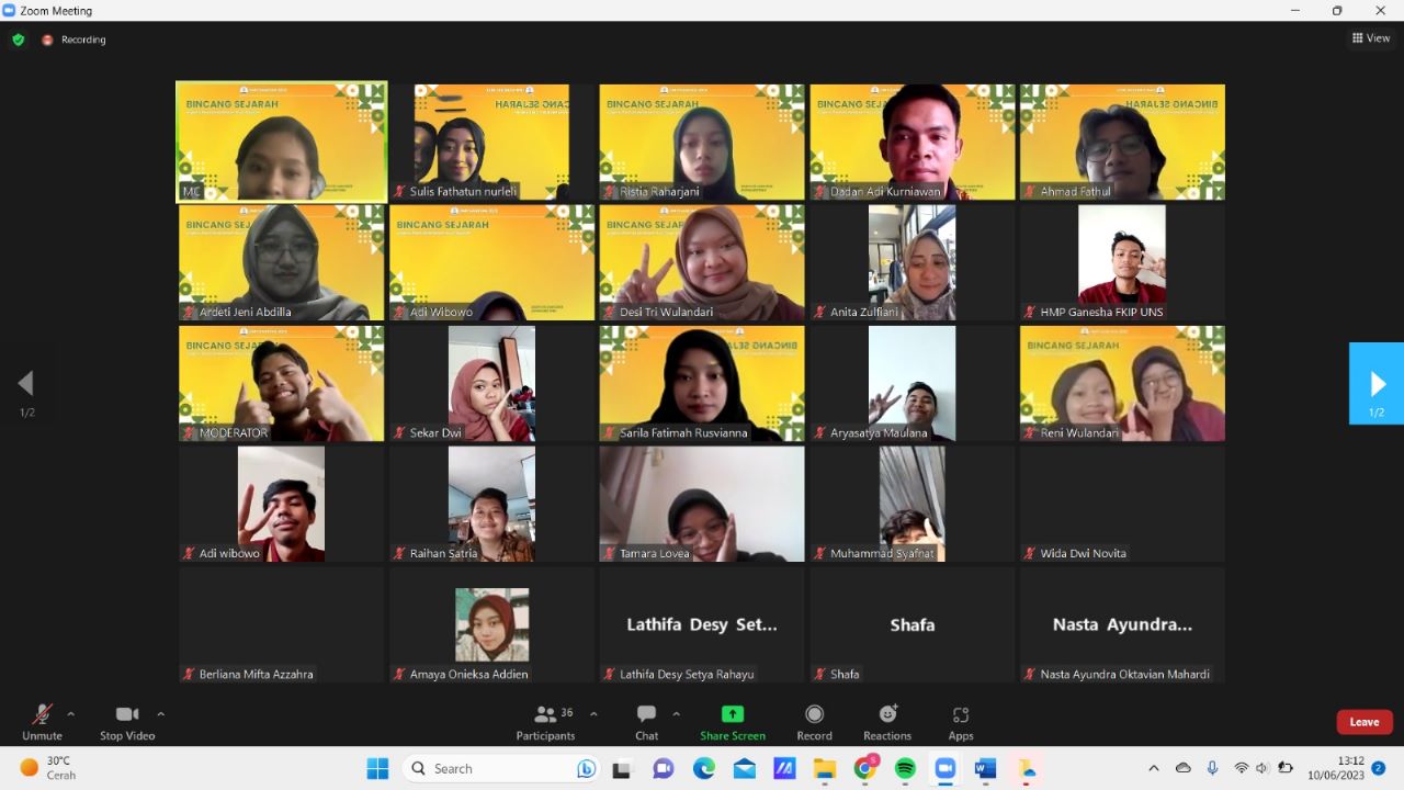 Bincang Sejarah yang dijadwalkan pukul 10.00 WIB harus terpaksa mundur 10.15 WIB sebab harus menunggu jajaran dosen untuk join dan juga adanya persiapan yang kurang matang karena perlengkapan yg sebagian belum siap. Bincang Sejarah mulai pukul 10.15 WIB dan selesai pada pukul 13.30 WIB. Diskusi Bincang Sejarah dimulai dengan pembukaan yang dilakukan oleh MC. Lalu menyanyikan lagu Indonesia Raya yang diputar oleh operator. Yang selanjutnya adalah sambutan Ketua Pelaksana yang akan dilakukan oleh Sekar Dwi Murti, yang keempat adalah sambutan Kak Rendra Rizky Yulianto selaku Ketua Umum HMP Ganesha, yang ke lima adalah sambutan Bapak Dadan Adi Kurniawan Spd. Mpd., acara selanjutnya adalah sambutan yang akan dilakukan oleh Kepala Program Studi Pendidikan Sejarah tetapi hal ini tidak dapat terjafi dikarenakan Kaprodi Pendidikan Sejarah Dr. Sutiyah Spd. Mhum. Tidak dapat bergabung di acara dikarenakan adanya acara yang tidak bisa di tinggal. Setelah sambutan selesai MC menyerahkan acara kepada moderator untuk memulai diskusi. Pertama Moderator membacakan CV pembicara pertama dengan baik, yang kedua adalah penyampaian materi yang dilakukan oleh Dr. Anita Zulfiani, S.H., M.Hum yaitu Esensi Pancasila dalam Kajian Sejarah Indonesia. Setelah penyampaian materi dari pembicara pertama selesai u kita beralih ke ice breaking yang dipimpin oleh Kak Ahmad, ice breaking kali ini menggunakan pertanyaan-pertanyaan yang Out Of The Box sehingga mampu merefreshkan pikiran peserta. Setelah Ice Breaking selesai kegiatan dilanjutkan dengan pembacaan CV pembicara dua oleh moderator yaitu Muhammad Rakha K. Acara selanjutnya adalah penyampaian materi mengenai sub tema kedua yaitu Nilai-nilau Kebhinekaan, Mewujudkan Profil Generasi Muda Pancasila yang Adaptif dan Kreatif yang akan disampaikan oleh Bu Ardeti Jeni Abdila. Dan acara selanjutnya adalah sesi tanya jawab, pada sesi ini dapat dilihat bahwa peserta aktif dalam bertanya baik untuk sub tema pertama dan sub tema kedua. Setelah sesi Tanya Jawab selesai makan moderator akan menyimpulkan hasil dari materi diskusi kali ini, sehingga peserta dapat menerima materi dengan baik. Setelah pembacaan kesimpulan selesai maka akan dilanjutkan dengan dokumentasi yang dilakukan oleh pihak operator. Karena sesi dokumentasi merupakan penghujung acara maka, setelah dokumentasi selesai acara Bincang Sejarah ditutup oleh MC. Pada saat acara berlangsung peserta yang bergabung juga cukup banyak lebih dari 50 peserta.