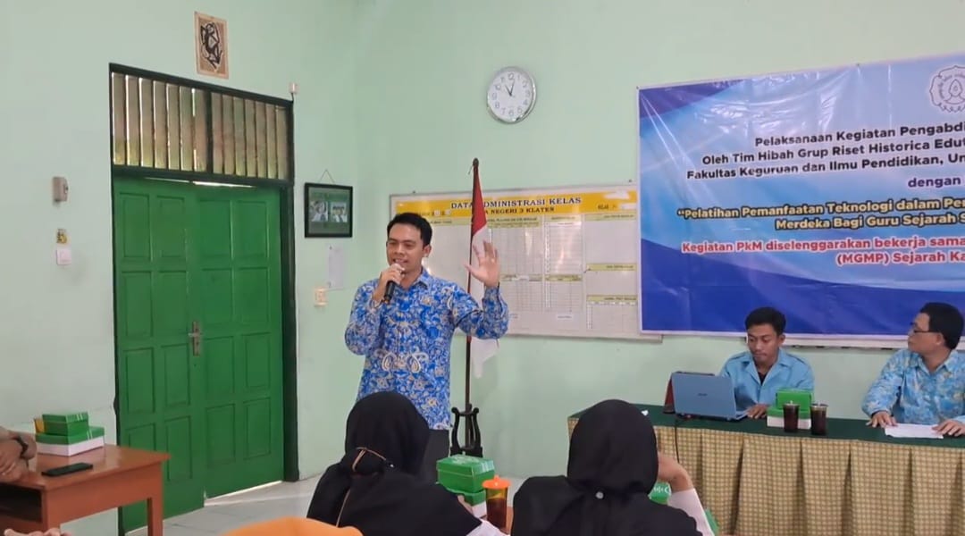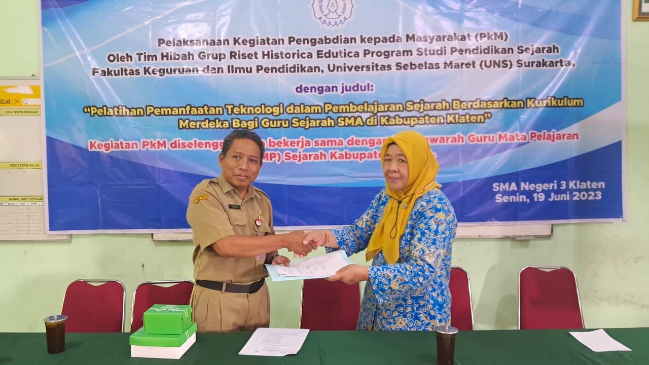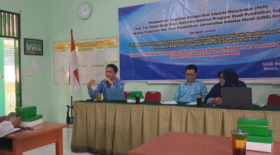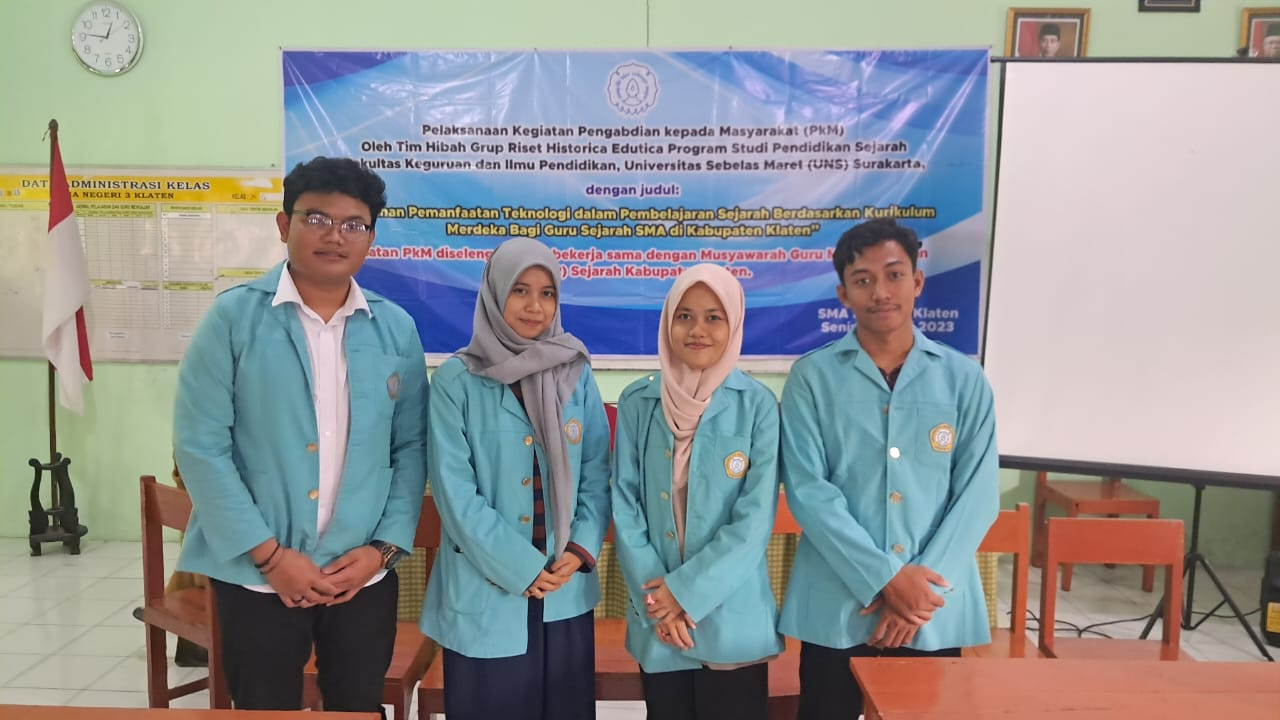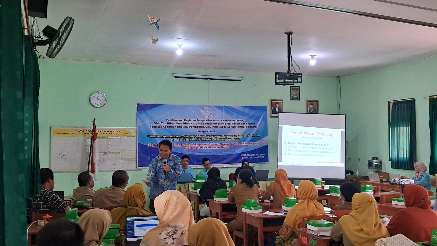 Program Studi S1 Pendidikan Sejarah FKIP Universitas Sebelas Maret (UNS) Surakarta melaksanakan kegiatan Pengabdian kepada Masyarakat pada Senin, 19 Juni 2023 di SMAN 3 Klaten. Pengabdian kali ini mengusung tema “Pelatihan Pemanfaatan Teknologi dalam Pembelajaran Sejarah Berdasar Kurikulum Merdeka Bagi Guru Sejarah SMA di Kabupaten Klaten”.