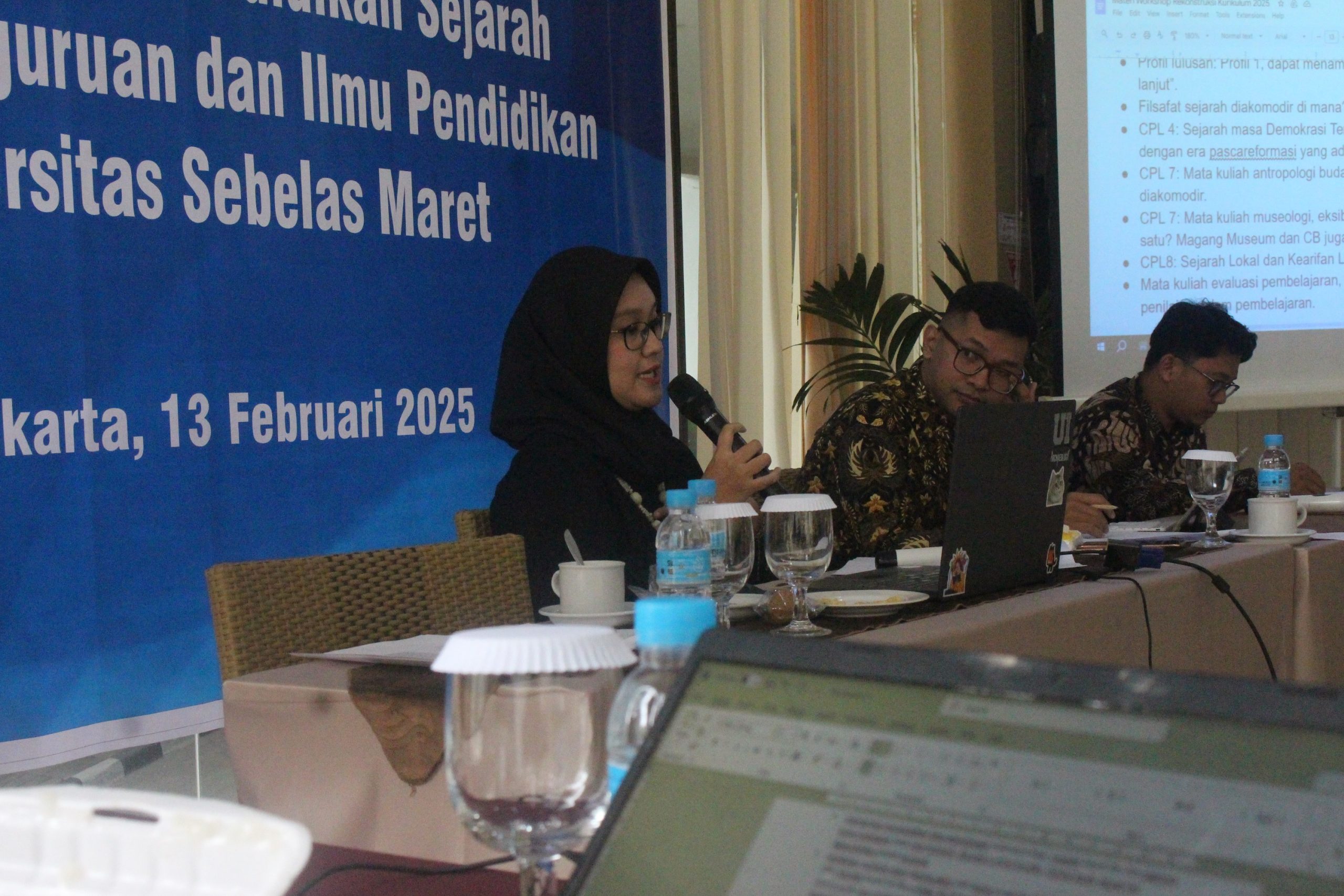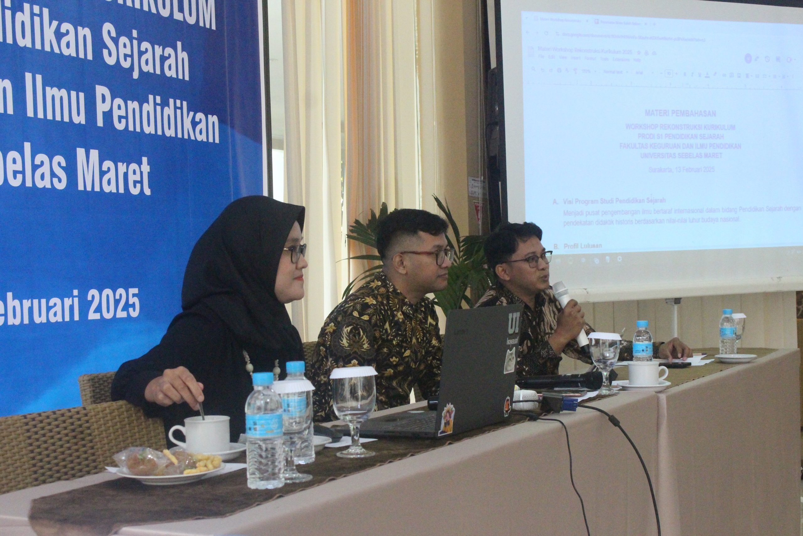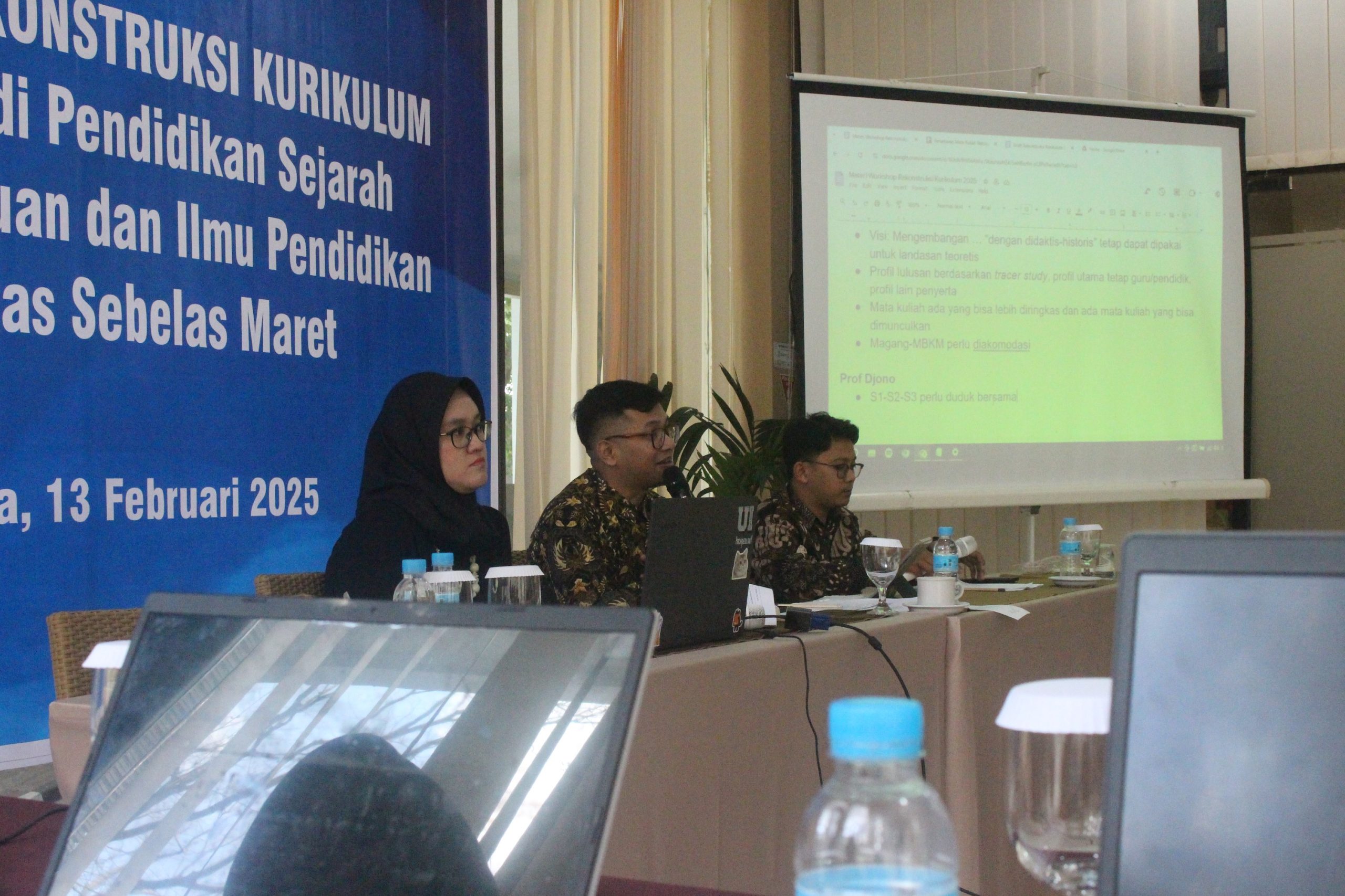 Pada hari Kamis, 13 Februari 2025, Program Studi S1 Pendidikan Sejarah Fakultas Keguruan dan Ilmu Pendidikan Universitas Sebelas Maret menyelenggarakan kegiatan “Workshop Rekonstruksi Kurikulum“. Kegiatan ini berlangsung dari pukul 07.30 hingga 13.00 WIB bertempat di Ruang Mangkunegara, Lantai 1, UNS Inn, Surakarta. Workshop Kurikulum Prodi diikuti oleh Wakil Dekan bidang Akademik FKIP UNS, Ketua Prodi, sejumlah dosen prodi termasuk para guru besar, admin prodi, sejumlah guru, alumni, stakeholder, dan mahasiswa.